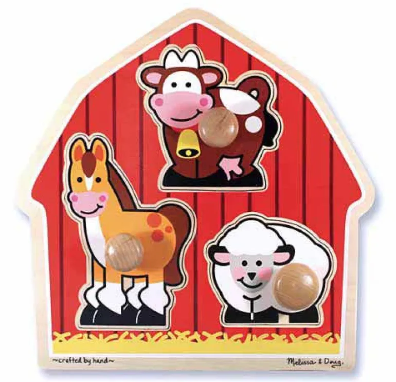 Charming farm friends live in the red barn and are always ready for puzzle play. This extra thick wooden puzzle includes three pieces, with jumbo wooden knobs for easy grasping. Full-color, matching pictures appear underneath each piece. A great activity to encourage hand-eye and visual perception skills.