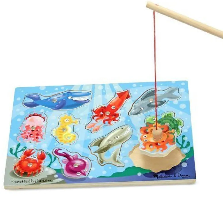 The ultimate catch-and-release fishing program, this magnetic wooden puzzle game features aquatic animal artwork. Use the magnetic fishing pole to “catch” the 10 colorful sea friends from the game board, then enjoy the challenge of returning them to the depths! A creative way to encourage hand-eye coordination and fine motor skills.