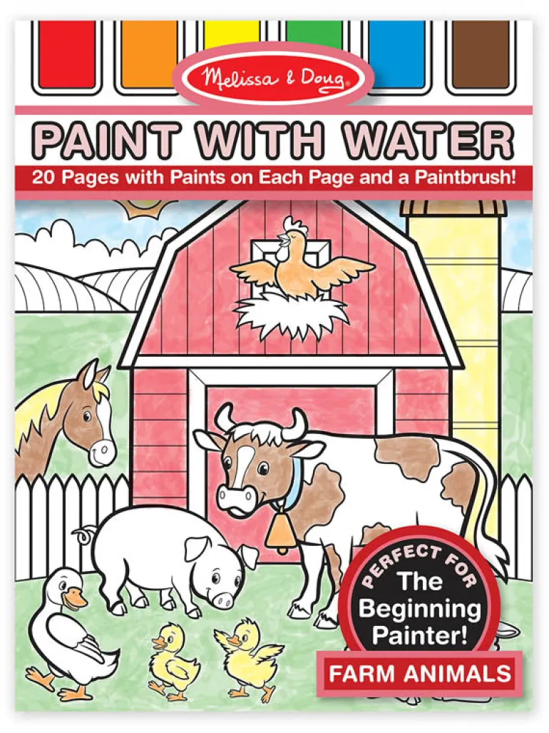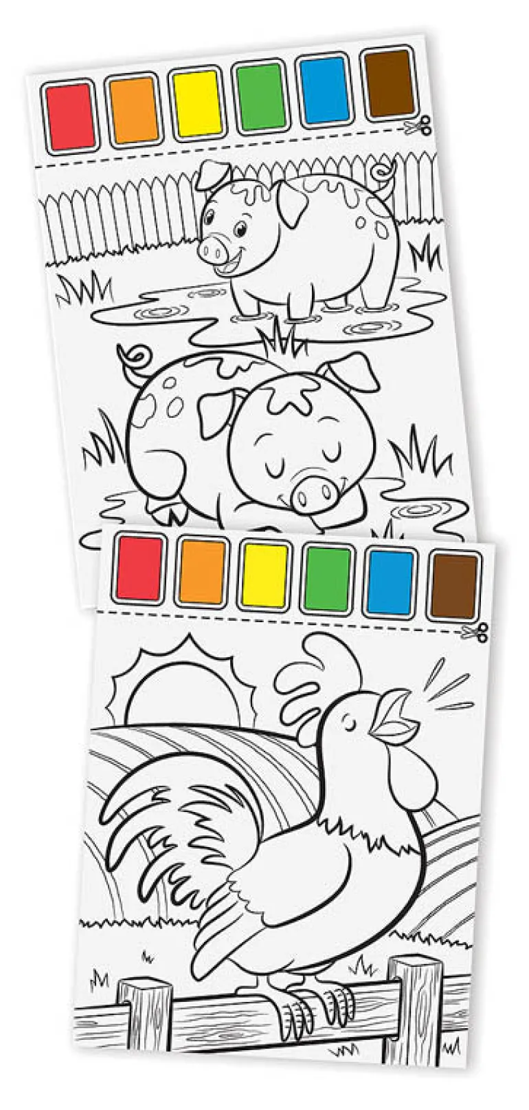 Thats right, learn to paint, with water! Its such a great way to get involved in painting, each sheet of paper has 6 colours along the top for you to wet your paintbrush and dab into the colour palette provided. No paint mess, no paint cleanup. Paint the farm chickens, tractor, Mummy cow and dont forget the baby chicks!