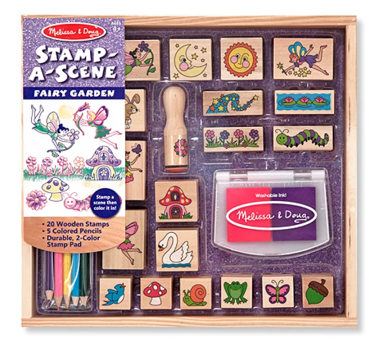 Fairies, flowers and garden critters can be combined in countless pretty ways! This extra-large stamp set for kids makes it easy to create an exciting storyline or a color-in scene: It includes 20 rubber-faced, wooden-handled outline stamps and a two-color stamp pad filled with pink and purple washable ink.