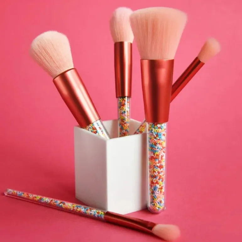 The twinkle sprinkle makeup brush set includes 5 soft, hypoallergenic, vegan and cruelty free brushes. Sprinkle filled handles make them bright, happy, and easy to spot under a pile of discarded toys.