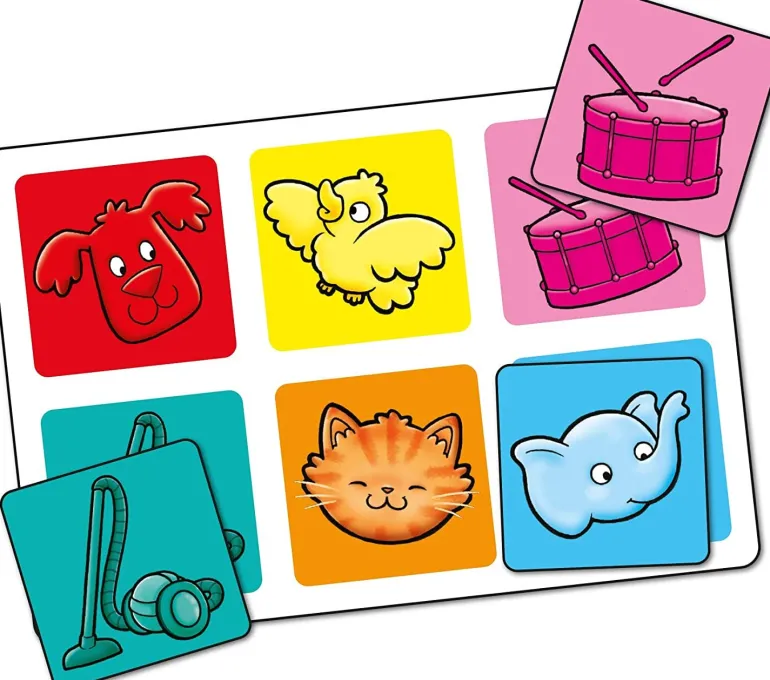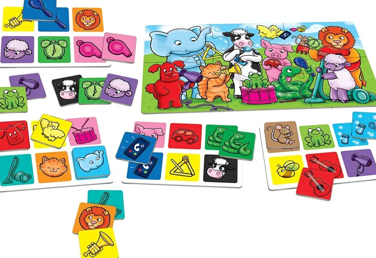 A fun-filled sound game where players listen to the sounds on the free Orchard Toys app or make noises themselves and match them to pictures on their playing boards. Children will have fun as they buzz like a bee, moo like a cow or hiss like a snake. First Sounds Lotto also includes a 6 piece jigsaw puzzle for added play value that can be used to encourage conversation from young children as they try to spot the sounds featured in the game.
