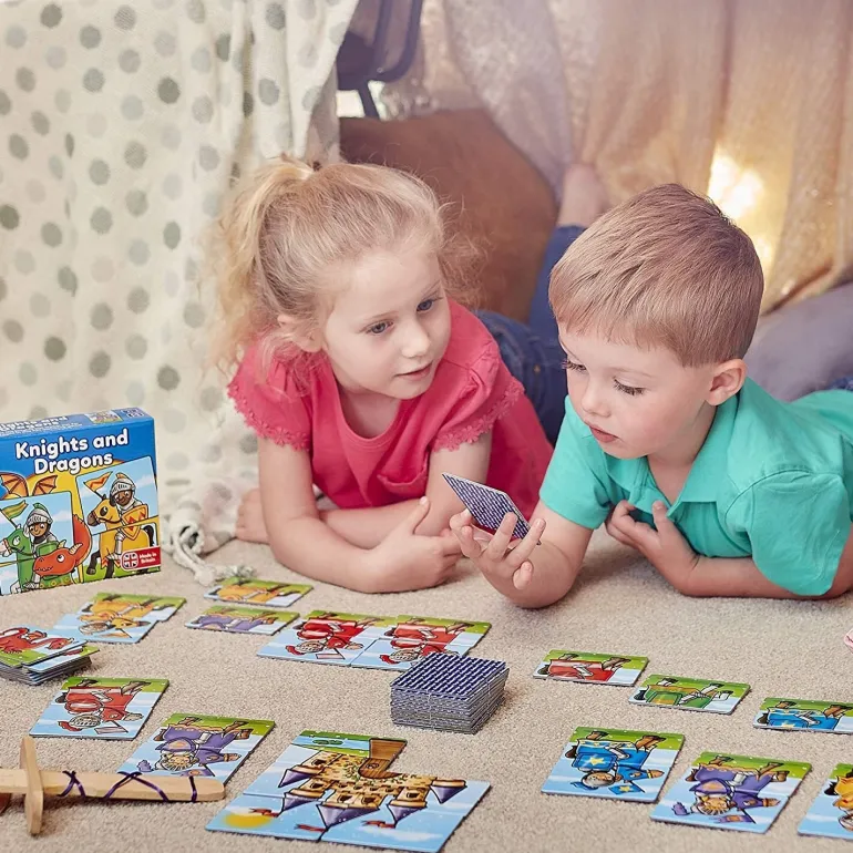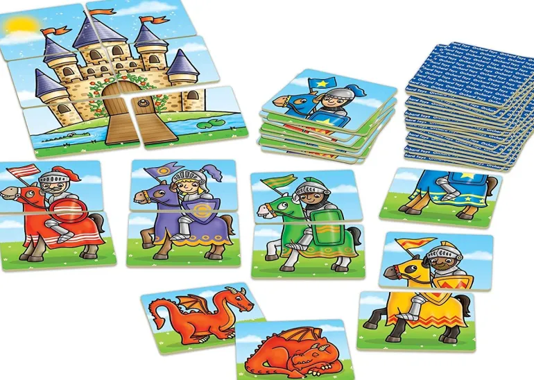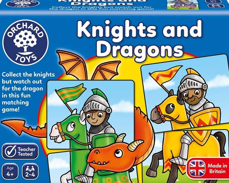 Players take turns to match as many noble knights as possible before the castle image is complete, but watch out for the dragon cards – an awake dragon will scare away a knight but a sleeping dragon could win back all the lost knights!