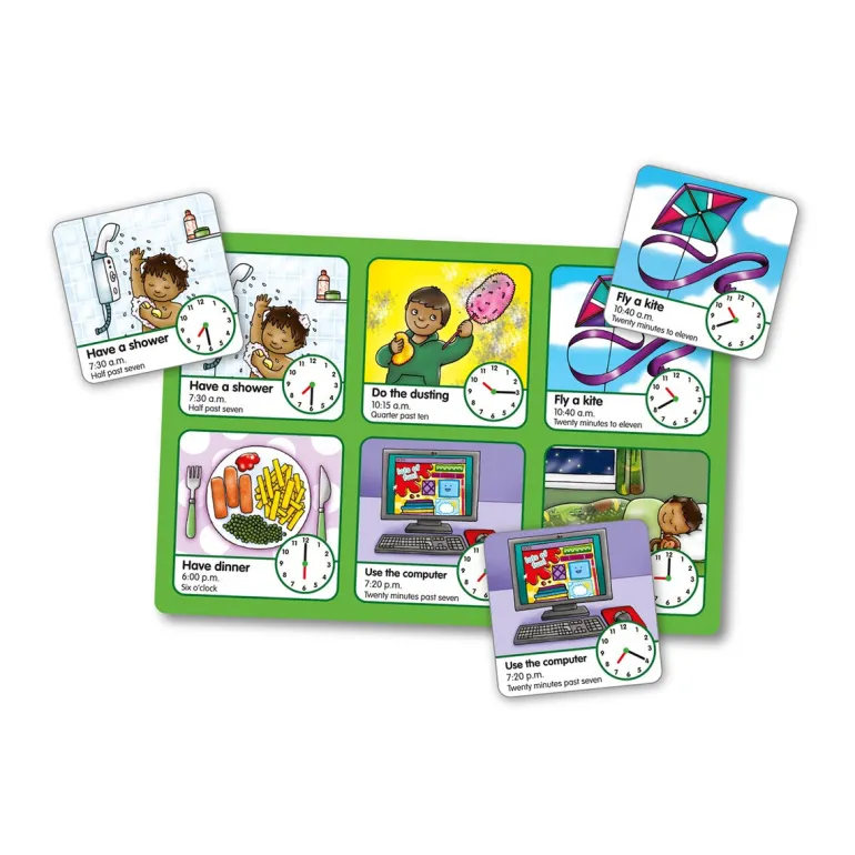 Children will learn about analogue and digital time telling in this fun lotto game! Cards show everyday activities – such as having breakfast and brushing your teeth – in analogue and digital times, which children are encouraged to say aloud whilst matching to the pictures on their board. There are four boards for players to choose from, each with a different set of daily activities.