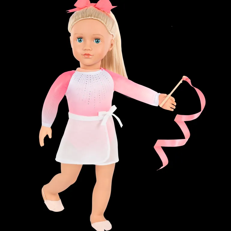 Perform fun dance routines with Diane! This Our Generation rhythmic gymnastics 18-inch doll has bright blue eyes that open and close, and her long blonde hair is fun to brush and style! Wearing a gradient pink-and-white leotard, Diane is ready to show the crowd her moves. She can rotate her arms and legs to wave the ribbon as she dances. And she can also bend her elbows and knees to perform leaps and stick the landing on her mat! Her leotard features easy-open closures to quickly put on and remove, so Diane can change into many colorful outfits to celebrate with her friends after the competition!