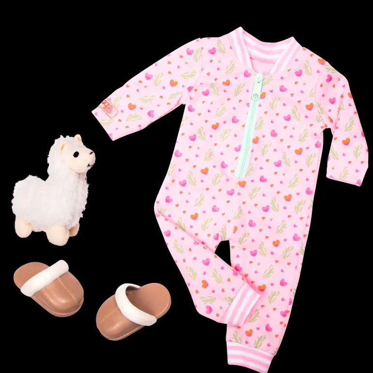 It’s bedtime, which means it’s time to dress your doll in comfortable pj’s before you both get tucked in. The Our Generation Llama Llullabies outfit for 46cm dolls makes bedtime fun and cuddly. It features an adorable pink onesie with heart prints and a turquoise zipper in the front, so you can quickly change your bestie before you say goodnight. It even comes with comfy slippers (in case she gets thirsty during the night) and a plush pet llama! Your doll can hold her super soft llama while she sleeps and dreams sweet dreams! She can also show off her new outfit to her friends during a slumber party or sleepover. Which one of your lucky dolls loves llamas the most? (Dolls sold separately)