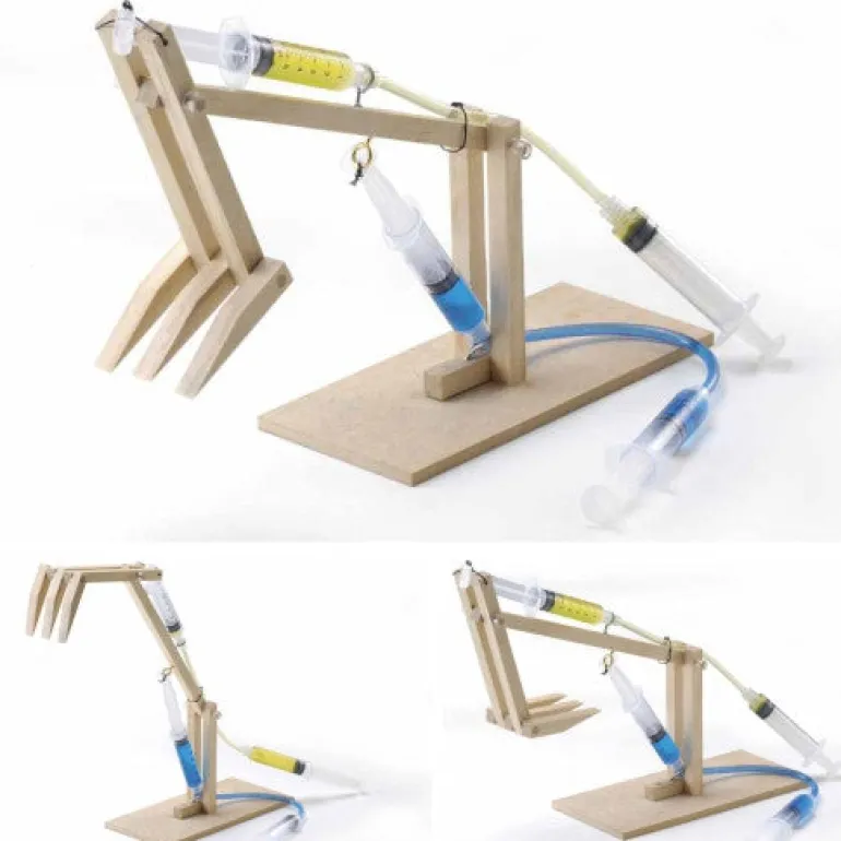 This model teaches the principles of levers and hydraulic power. The mechanism includes two hydraulic cylinders and can be adjusted to provide either digging or scooping actions.