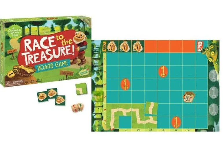 Unlike most games Race to the Treasure encourages kids to help each other to beat the game. This way, kids work together, they help each other, and everybody wins! A cooperative game eliminates stress, builds self-esteem, and teaches kids that playing together can be fun!