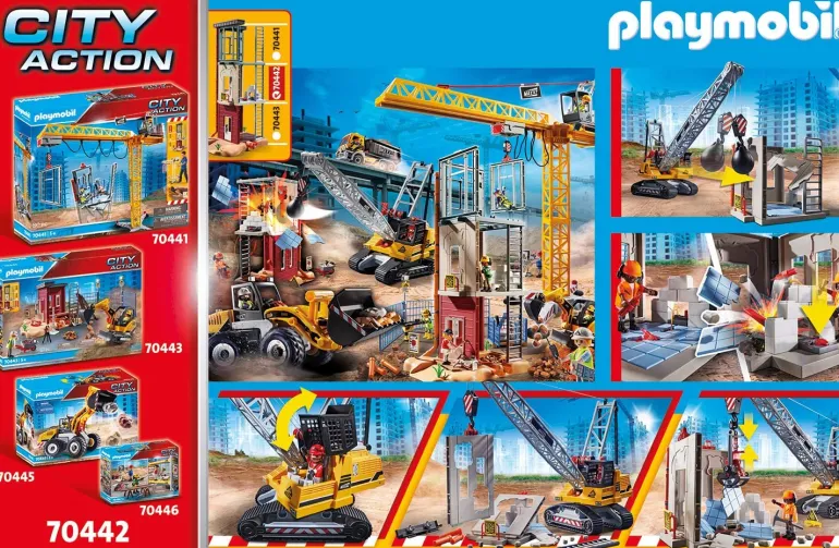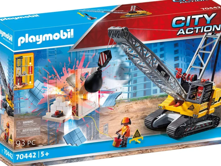 Set includes two figures, cable excavator, wrecking ball, building materials, safety equipment, and many other accessories.