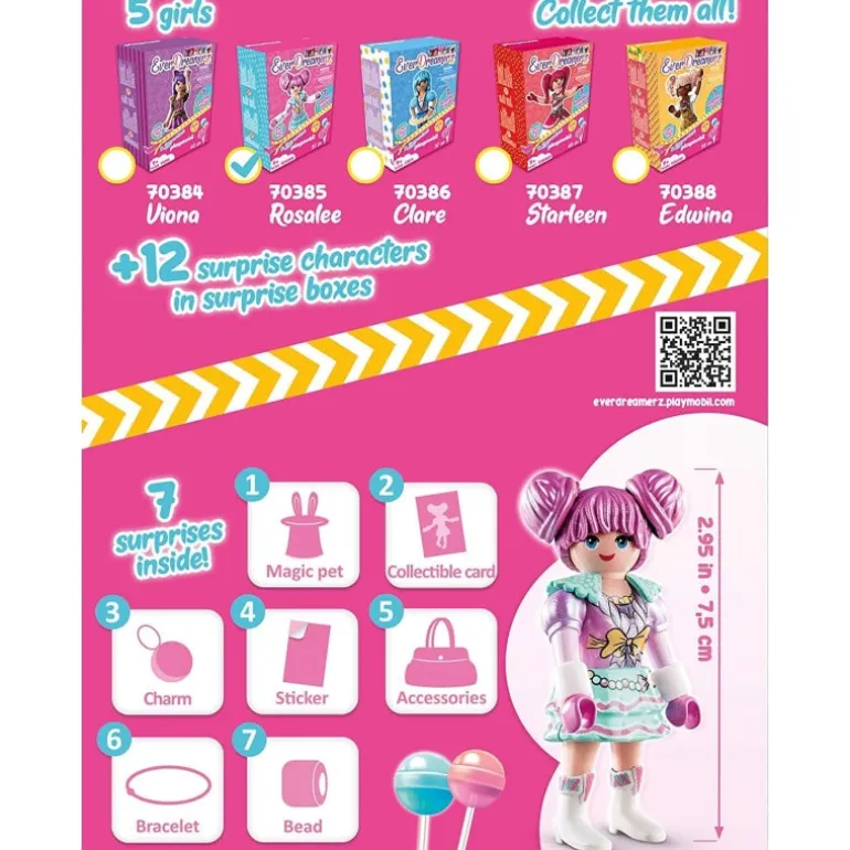Rosalee, Viona, Edwina, Clare and Starleen are five friends with big dreams. When the girls find a magical amulet, a portal opens into another universe, to the land of their dreams. First the five friends travel to Rosalee’s dream world, where everything revolves around sweets because Rosalee loves sweets more than anything. As long as she is allowed to eat sweets herself, she always likes to share selflessly with her friends. But it’s not only sweets that appeal to this lively girl – she also loves to eat marshmallows, cupcakes and chocolate. Besides her friends, Rosalee is accompanied by her beloved flamingo and of course she also has a bag to keep her sugary treasures. Rosalee’s only fear is the dentist, but her friends help her overcome it. The playsets contains EverDreamerz character Rosalee with her flamingo and many sugar-sweet accessories in a fold-out box. Rosalee has a candy as a special charm pendant.
