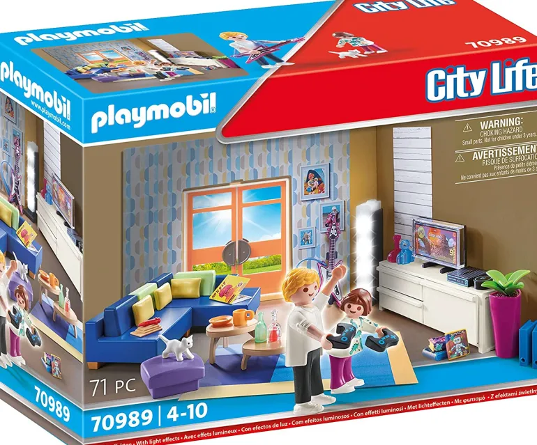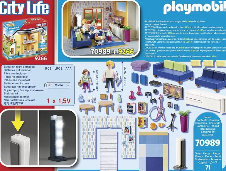 The set contains two PLAYMOBIL figures, a living room set with sofa, coffee tables, sideboard, TV, electric guitar, shelf, light column and many other extras. The light column can be switched on and off via a button.