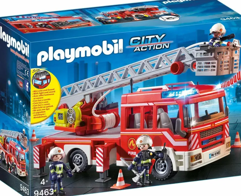 With blue lights, sirens and high speed, the Playmobil firefighters drive to the site with the fire brigade ladder vehicle. Now it has to be fast! Two floors of the house are already in flames. But the Playmobil firefighting experts are well trained. Within seconds they have secured the danger point, extended the ladder and made the extinguisher hoses ready for use. Luckily, the fire is brought under control after a short time. The fire brigade ladder vehicle is equipped with cool lighting and sound effects.