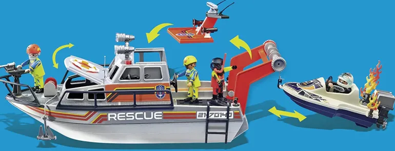 Set includes four figures, fire boat, speedboat, life buoy, rescue drone, and other accessories.
