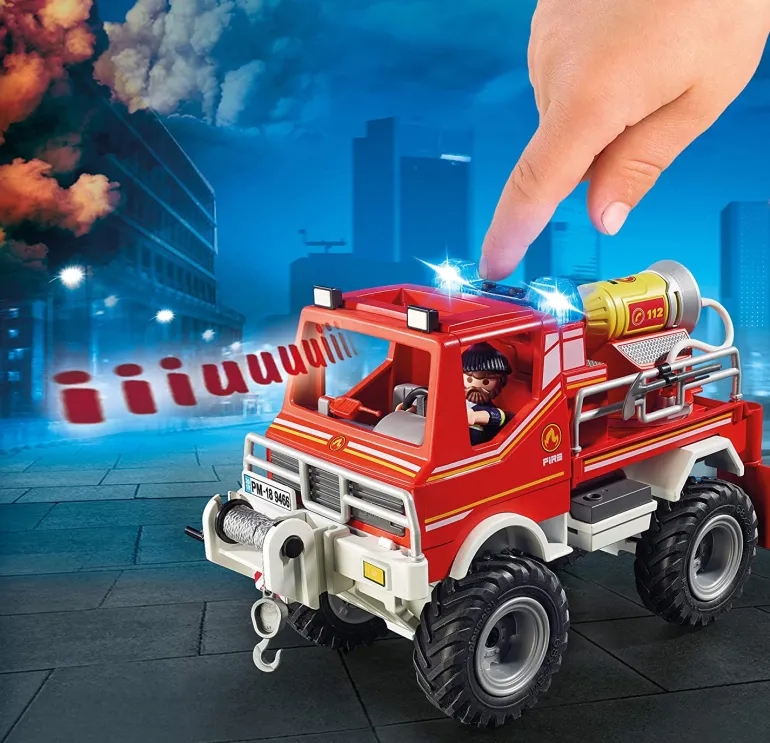The Fire Truck includes cable winch, fire-extinguishing foam cannon, and functioning lights and sounds (3 x AAA batteries required).