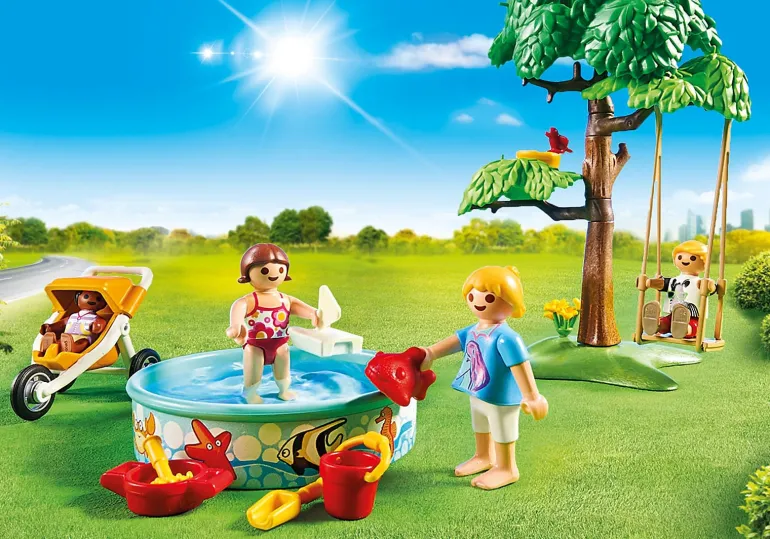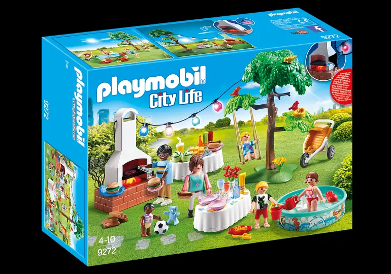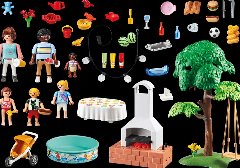 Set includes: Figurines: 1 man, 1 woman, 2 girls, 1 boy, 1 baby; Animals: 3 birds, Accessories: 1 stone grill, 1 tree with children’s swing, 1 paddling pool, 2 tables, 1 stroller, 1 lantern chain, 2 trays, 4 plates, 2 bottles, 2 champagne glasses, 1 drinking cup, 1 Bowlenglas, 3 tubes, 1 barbecue tongs , 1 cake knife, 2 burgers, 2 hot dogs, 1 roll, 1 football, 2 logs, 1 watermelon, 1 bird’s nest, 1 teddy bear, 1 toy catamaran, 1 sand toy, 1 game fish, 1 bouquet