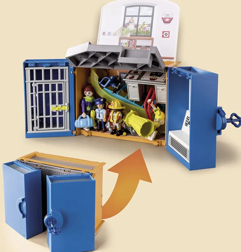 Accessories: 1 play box with command center including jail cell, slide, ladder and net gun plus net, 1 desk, 1 chair, 1 monitor, 1 barrier with 2 warning lights, 2 large pylons, 2 flames, 1 searchlight, 1 travel bag, 1 fire extinguisher with backpack plus jet pipe, 1 megaphone, 1 microphone, 1 radio, 1 flashlight, 4 gems