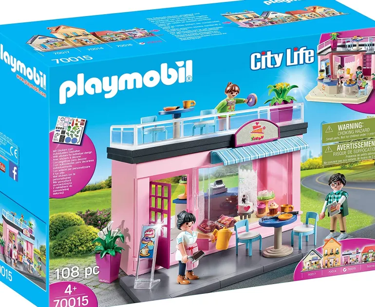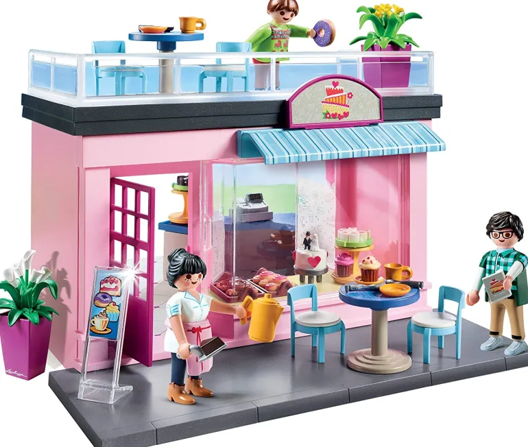 This place has all the joys of a bakery and bistro serving a great variety of food and drink options Just pick whatever your craving pay a t the register and find a place to sit! There’s a nice rooftop area for enjoying your meal with a view of the town Set includes three figures coffee maker cupcakes donuts cash register menu board dishes and utensils decorative plants tables chairs and many other accessories