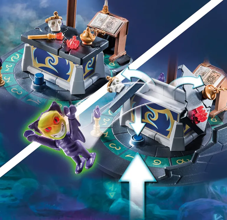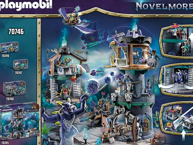 The playset includes the dark Novelmore wizards Umbrathor and Vermithor, a two-storey demon portal with dungeon and altar, two demons, a bat staff, mask and many other magical extras. The altar plate can be blown away via a mechanism.