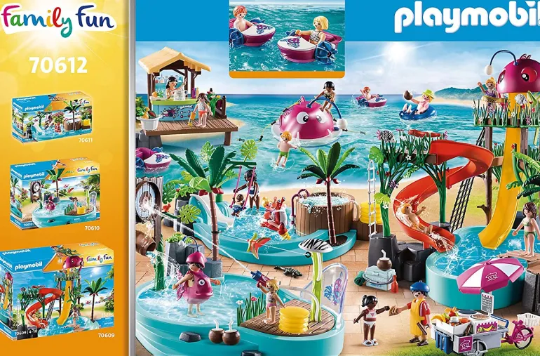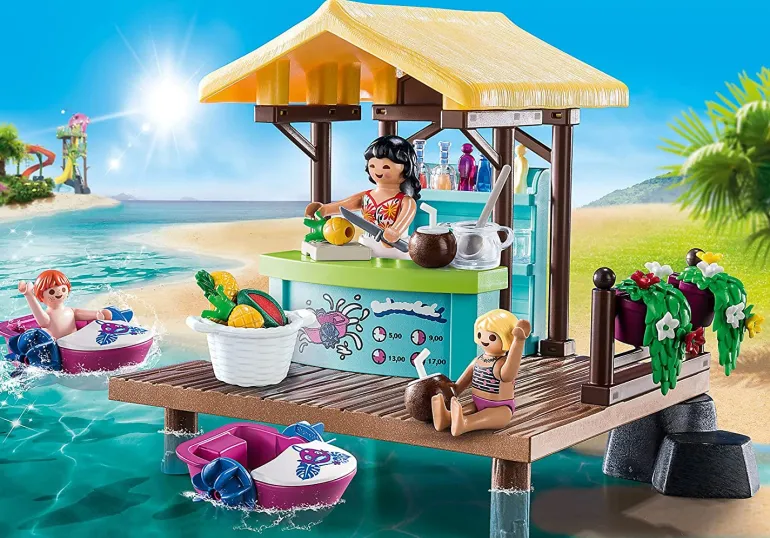 Playset contains three PLAYMOBIL figures, a woman and two children, two paddle boats, a juice bar with equipment and many other extras for a fun day at the beach. The boats float in the water.