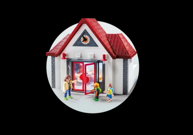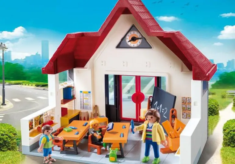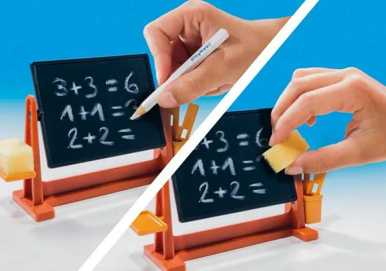 Classroom with board for marking and wiping. The school clock has movable pointers.