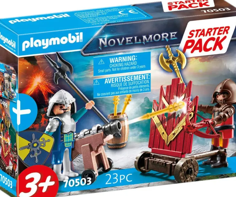Set includes two figures, cannon, shield, crossbow, and other accessories. Combine this set with the PLAYMOBIL Starter Pack Novelmore Fortress (sold separately) for even more exciting adventures.