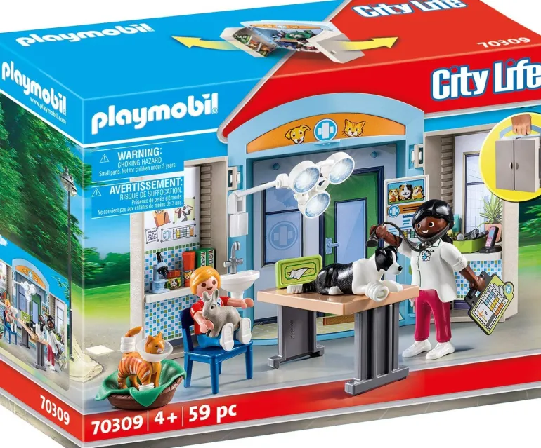 This set contains a small veterinary practice with vet and boy, border collie, cat, rabbit, doctor’s lamp, examination table, neck brace, bandages and many other extras. A great play set for all animal lovers.
