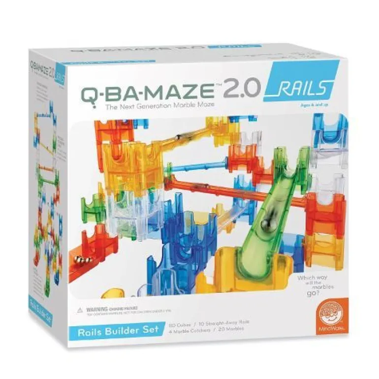 The Q-BA-MAZE Rails Builder Set with 10 straight-away rails that connect easily to any cube or to each other to create tracks that send your marbles zigzagging through the maze! With 40 single-exit cubes, 20 bottom-exit cubes, 20 double-exit cubes, 4 marble catchers, and 20 marbles, the possibilities are endless!