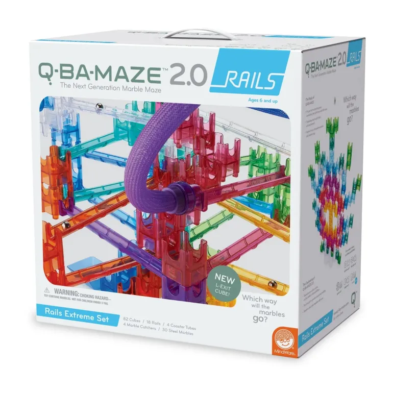 Q-BA-MAZE Rails Extreme, complete with 18 straight-away rails that connect easily to any cube or to each other to create tracks that send your marbles zigzagging through the maze of colourful cubes. With another 82 cubes, 4 coaster tubes, 4 marble catchers, and 30 steel marbles, the possibilities are endless!