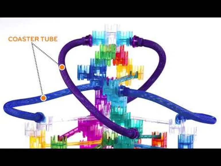Q-BA-MAZE 2.0: Rails Extreme Set – a unique system of colourful cubes that interlock to form an exciting marble run. The big difference? The configurations are UNLIMITED: create runs shaped like rockets, robots, butterflies, or whatever design you want!
