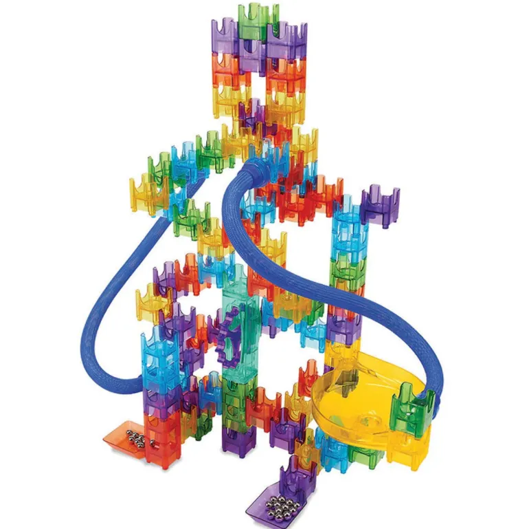 Q-BA-MAZE is a unique system of colorful cubes that interlock to form a marble run. The big difference? You can create marble maze sculptures in any form such as animals, robots, towers, and geometric shapes. Configurations are unlimited, allowing for unpredictable action when the steel marbles travel different routes. Follow the plans provided in each set, get inspired by our plans section below, or create your own!