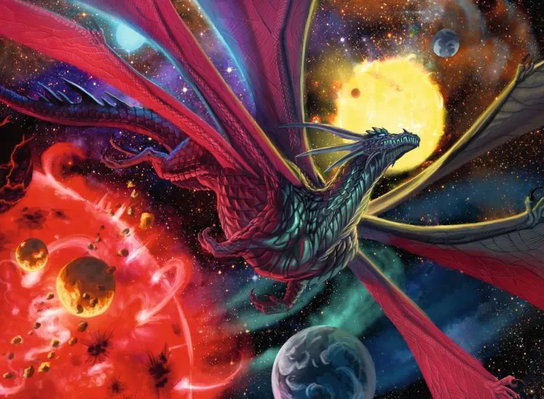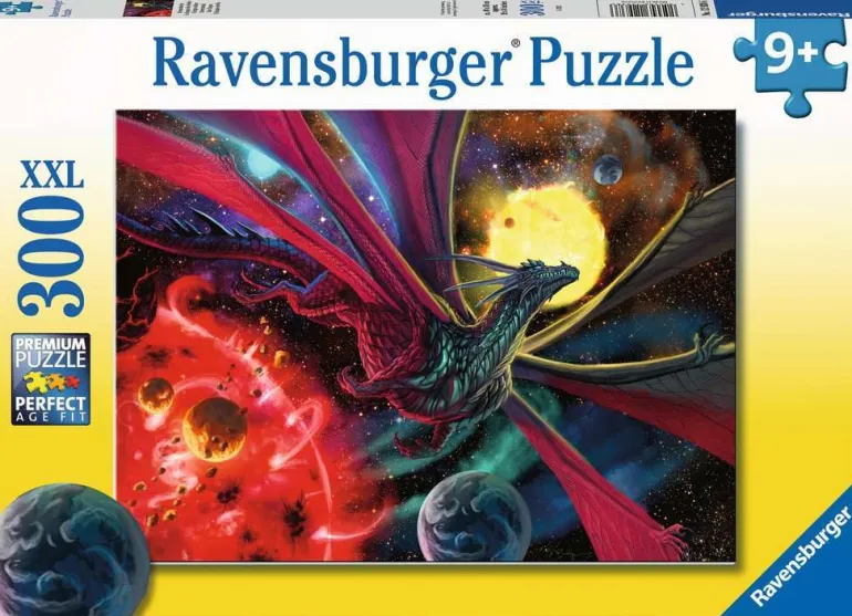 The fantasy worlds of space travel and ancient dragons collide on this dramatic design. A dragon flies in deep space, away from a deep red planet and a glowing golden star. Is he flying away from danger? Where is his destination? This dramatic and unusual design would make a great gift or pastime for anyone who loves fantasy stories and is a sure way to start some interesting, imaginative conversations.
