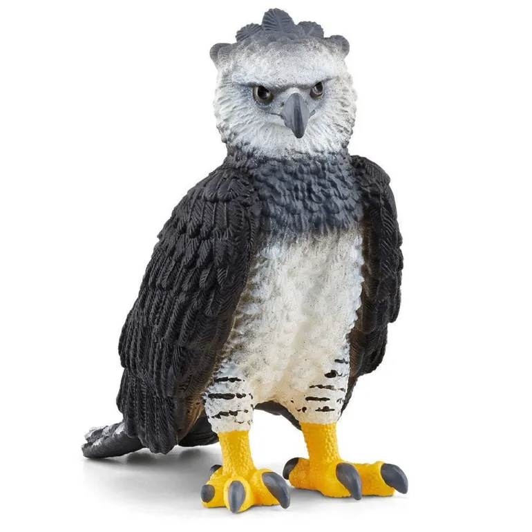 The Schleich Harpy Eagle figurine is an accurate representation of the large, impressive bird of prey. It is sculpted in a standing pose, showcasing its white chest and face, with its black wings resting at its side, and grey features on its neck and head with highly detailed feathers all over. Its eyes are focused, and its feet are bright yellow showcasing its dark taloned claws. This magnificent raptor is the perfect addition to your animal model collection.