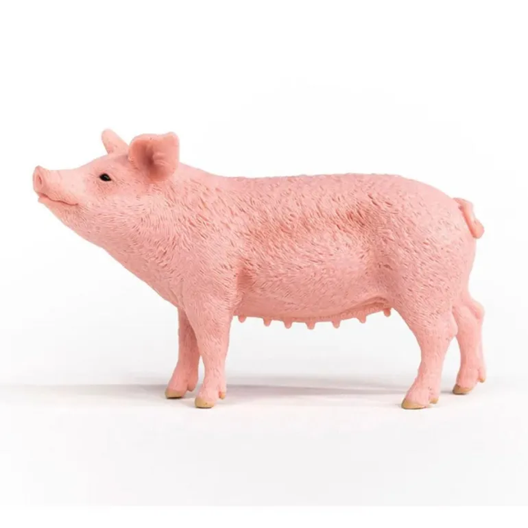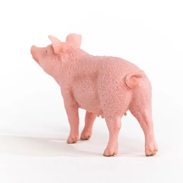 Schleich’s Pig is a great model of the classic farmyard friend. It is painted almost entirely pale pink, with the exception of its tan coloured hooves and large black eyes. Its body is covered in impressively textured bristled hair with smooth ears and snout are alert and pointed up as though it is sniffing something. Add this awesome pig figurine to your model animal collection and have some fun rolling in the mud and imaginatively playing in your fun farm world. This Pig pairs perfectly with the Schleich Piglet, so add this oinking duo to your farm animal collection.