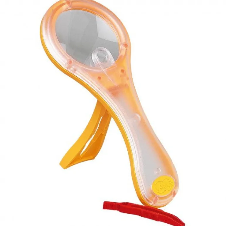Magnifying lens containing a second high-powered magnifier, the handle opens like a compass, permitting its use on a work top with hands free. Extractable tweezers are inserted in the sleeve, making it possible to easly handle objects of small dimension.