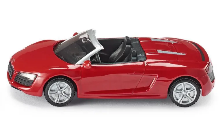 Audi R8 super sports car with extra wide tyres on sport wheel rims, die-cast metal body and headlights at the front and rear.