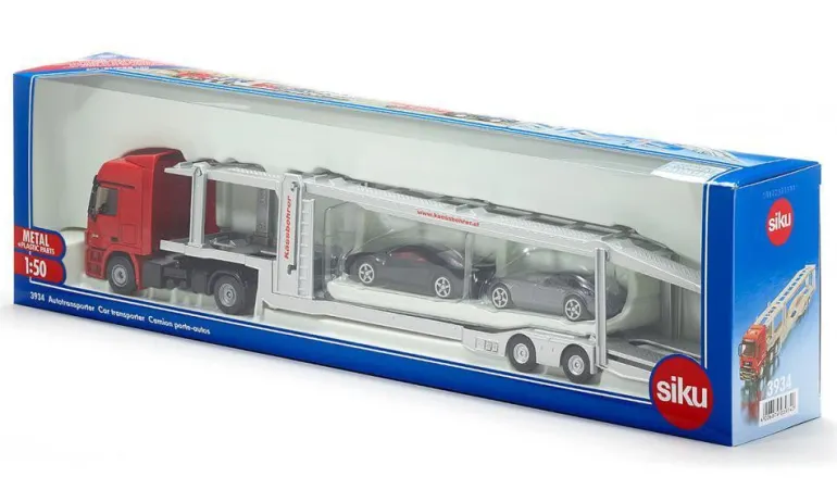 Car transporter with three-axle MAN tower and two-axle multi-function trailer. This model is almost entirely produced in die-cast metal and can transport up to eight SIKU private cars! The option to fully lower the rear section of the top platform means trucks and tractors from the SUPER50 and FARMER50 series can also be transported.