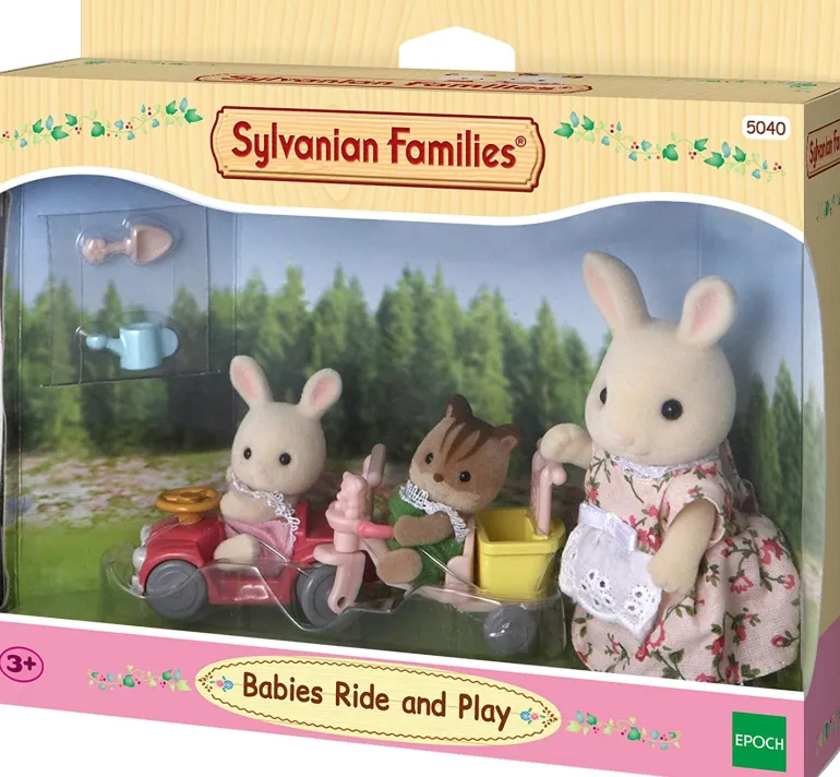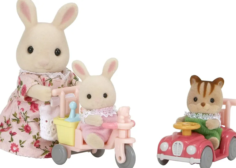 Mother rabbit takes babies to ride around a park in their new push car and tricycle! Set includes mother rabbit, baby rabbit and squirrel, tricycle with basket & rotating wheels, car with rotating steering wheel & tyres, 2 attachable push handles, watering can and shovel.
