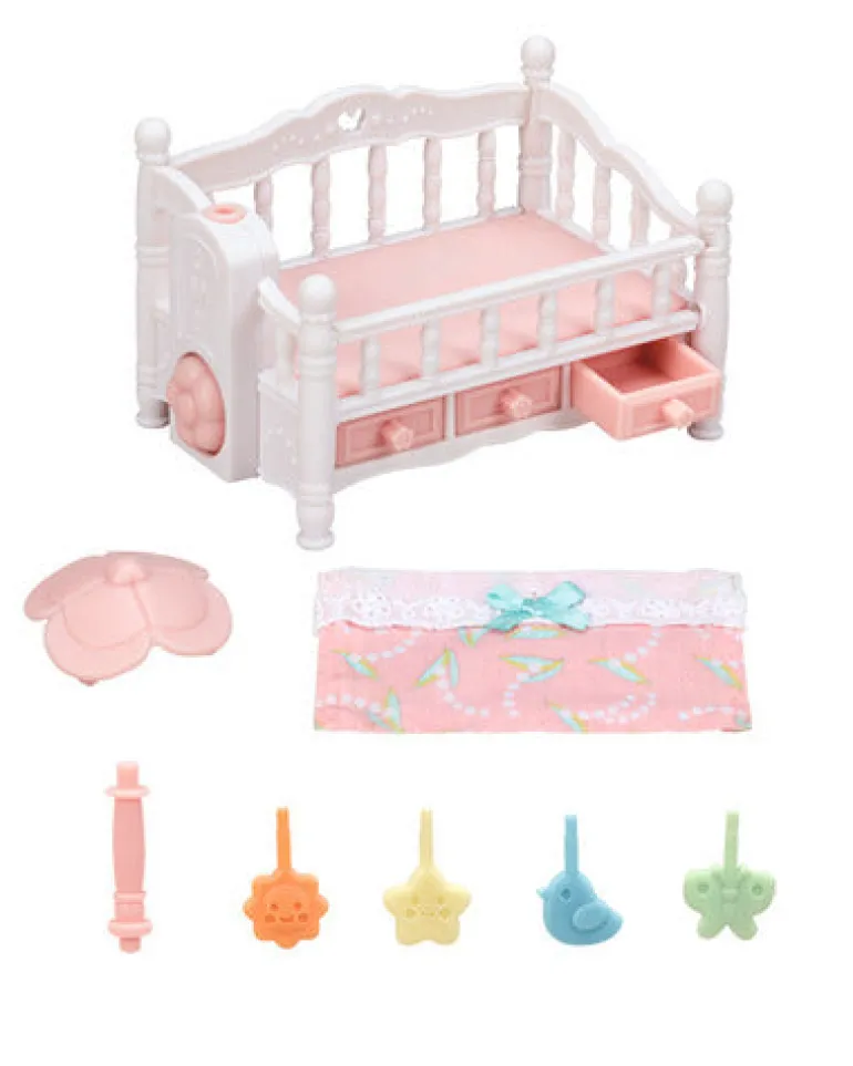 The Crib with Mobile set comes with a cute crib that sleeps triplets (cradled babies) side by side. Turn the flower dial on the side of the bed to make the mobile spin.