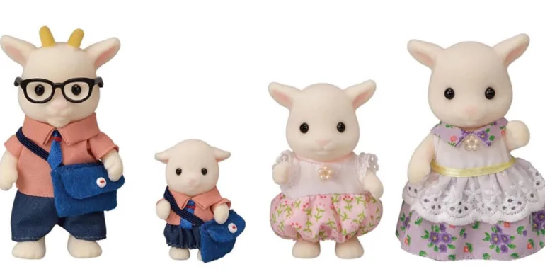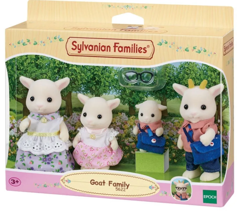 The Sylvanian Families family goat consists of dad with satchel, baby son with satchel, mum in fancy clothes and big sister in chic clothes. Dad wears glasses.