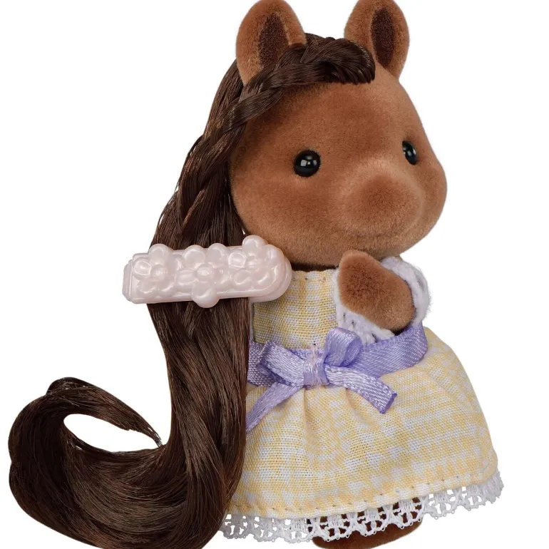 The Sylvanian Families Sweet Pony Friends playset includes a standing mirror, a comb, a brush, a crown, hair ties, hair clips, handbags and two pony girls figures with hair for styling. The pony girl vera is brown and wears a dress. Pony girl Giselle is silver and wears trousers and a top. The arms and legs of the figures can be moved to set them in different poses.