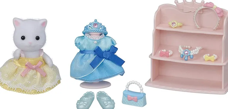 The Princess Dress Up Set contains Persian Cat girl Lyra, with a lovely yellow dress, a separate blue dress, fashion accessories, and furniture. Mix and match dresses, tiara, accessories, and shoes, to give your Sylvanians a princess makeover! The accessories can be displayed on the shelf. The dress can be placed on the mannequin. The tiara, necklace, and earring feature shiny rhinestones.