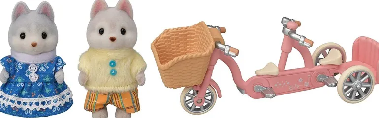 The Tandem Cycle set contains Husky girl Pauline and Husky boy Hayden, with a tandem bicycle. A baby figure can ride in both the front basket and back seat, so there’s room for up to four to ride the tandem at once.