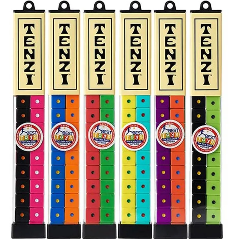 The world’s fastest game! Everyone gets ten dice. Someone says, “Go.” Then everyone rolls and rolls as fast as they can until someone gets all their dice on the same number and shouts “TENZI.”